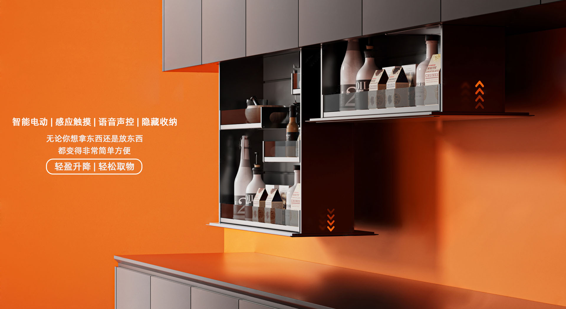 电动升降橱柜可轻松调节高度、避免弯腰或踮脚、优化垂直空间利用、电动操控,省力安全、通过其灵活的升降能力、智能的控制方式和多样的适配性,为不同场景下的空间优化和人性化体验提供了出色的解决方案。它不仅能提升生活便利性和舒适度,还能在商业领域挖掘空间价值和创新点。